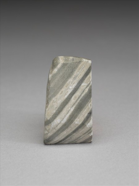 凝灰質粉砂岩。斜條紋,白、灰色交替。對稱梯形,小型,器體小而厚實,四邊切割整齊,背面平整,邊緣有一些小打剝痕,正面微鼓,無段,近頂端有明顯的打剝痕,器兩側平整,惟留一些打剝痕,全器器表拋磨光滑;平刃略斜,偏鋒,刃緣有一些小傷。
