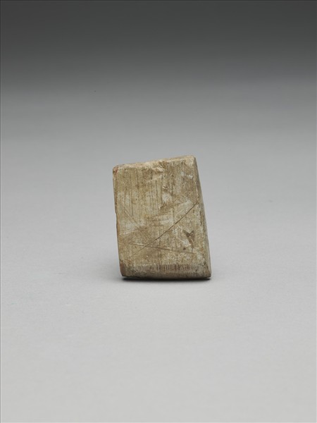 細直線條紋,灰白色。對稱梯形,小型,器體扁平,四邊切割尚稱整齊,背面平整,有二處打剝痕,正面微鼓,無段,器一側平整,另一側有一處較明顯的打剝痕,全器器表拋磨光滑;平刃略斜,偏鋒,刃緣有許多小傷。
