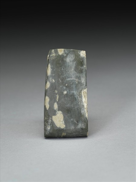 暗灰青色。對稱梯形,小型,器體扁厚,四邊切割整齊,背面平整,有多處打剝痕,正面微鼓光滑,無段,器兩側平整,惟留多處打剝痕,全器器表拋磨光滑;平刃,偏鋒,刃緣有一些細傷。
