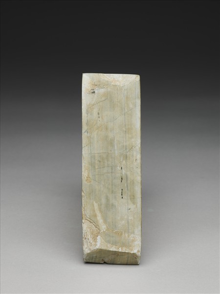 細直線條紋,灰綠色。長方形,中型,器體扁平,四邊切割整齊,背面平整,有二處較明顯的打剝痕,正面斜平光滑,有段,聯部(上身)與用部(下身)間的落階較淺,兩部分的區分清楚,器一側平整,另一側有打剝痕,全器器表拋磨光滑;平刃略斜,偏鋒,刃緣有一處較明顯的崩傷,餘屬細傷。