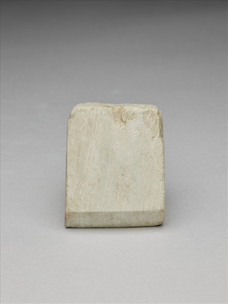 斜線條紋,灰色。對稱梯形,小型,器體扁厚,四邊切割整齊,背面平整有打剝痕,正面略鼓光滑,有段,聯部(上身)與用部(下身)間的落階較深,兩部分的比例接近,聯部面尚稱平整,有剝製痕,器兩側均帶有打剝痕,全器器表拋磨光滑;平刃,偏鋒,刃緣有細傷。