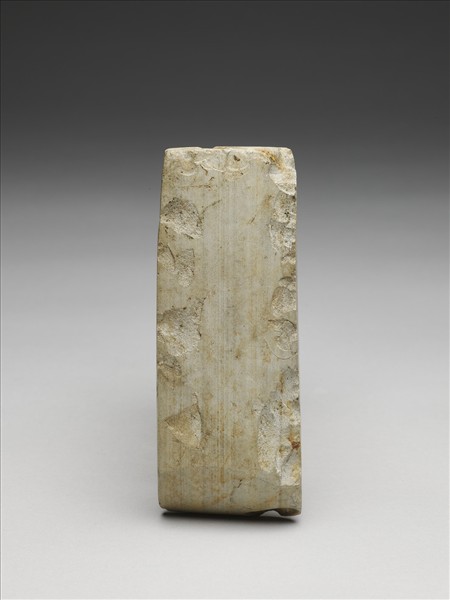 灰色條紋。對稱梯形,中型,扁平,器體厚實,四邊切割整齊,背面平整,惟沿著兩側有多處崩傷,有段,聯部(上身)與用部(下身)間有一稜脊,器體表面拋磨光滑;稜脊極淺,聯部面尚留一些打擊傷;平刃,偏鋒,一處較明顯的崩傷,刃斜面部分亦有一較大的傷。