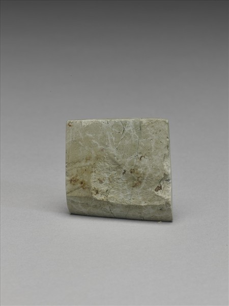 有白絲網紋斑,灰色。對稱梯形,小型,器體扁平,四邊切割整齊,背面平整,惟較明顯的表面崩傷,正面出現落階,有段,聯部(上身)與用部(下身)間區分明顯,器體表面拋磨光滑;聯部面平整略鼓,其頂的面有連續的打擊傷,然尚稱平整;斜刃,偏鋒,刃緣有多處小傷。