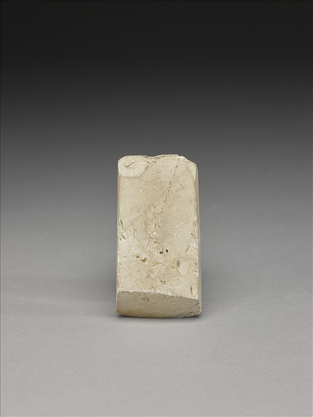 風化較深,灰白色。近於長方形,小型,器體厚實,四邊切割整齊,背面平整,有一些打剝痕,正面伏鼓,有段,聯部(上身)與用部(下身)間有一弧線形、不明顯的凸脊,兩部分區分不是很清楚,兩部分的比例接近,器兩側平整無明顯的傷,器體表面拋磨光滑;聯部面平整微鼓,頂一端角崩殘;平刃微弧,偏鋒,刃緣有小傷。