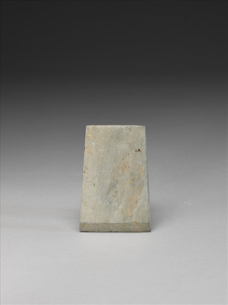 灰色。對稱梯形,小型,器體寬扁平,四邊切割整齊,背面平整,有一處淺的表面傷,正面斜而平整,有段,聯部(上身)與用部(下身)間有明顯的落階,兩部分區分清楚,器兩側平整無傷,器體表面拋磨光滑;聯部面平整,惟留一些極小的打剝痕,其頂端面平整;平刃,偏鋒,刃緣有小傷。
