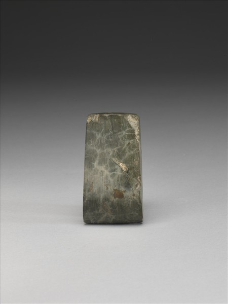 絲網紋斑,直線條紋,青綠色。對稱梯形,小型,器體厚實,四邊切割整齊,背面平整,有一處較大的打剝痕,正面微鼓,有段,聯部(上身)與用部(下身)間沒有落階,僅起淺的脊稜,兩部份區分不是那麼清楚,聯部面平整光滑,器兩側平整光滑,全器器表拋磨光滑;平刃,偏鋒,刃緣有一些凹痕,痕面光滑。