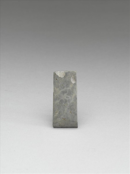 絲網紋斑,細直線條紋,青灰色。對稱梯形,小型,器體扁平,四邊切割整齊,背面平整,有兩處較明顯的表面傷,正面微鼓,有段,聯部(上身)與用部(下身)間的落階明顯,兩部份區分清楚,聯部面平整,表面光滑,器一側平整,另一側亦平整,惟留一打剝痕,全器器表拋磨光滑;平刃,偏鋒,正面的刃面曾加磨飾過,刃緣有一些細傷。