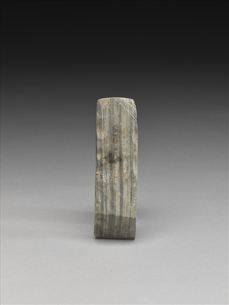 凝灰質粉砂岩。條紋,白、灰色交替。對稱梯形,中型,器體厚實,四邊切割整齊,背面平整,有一些打剝痕,正面伏鼓,有段,聯部(上身)與用部(下身)間的落階較深,兩部分的比例接近,段面不甚平整,有多處打剝痕,器兩側平整,惟留一些打剝痕,全器器表拋磨光滑;平刃略斜,偏鋒,刃緣有一些小傷。