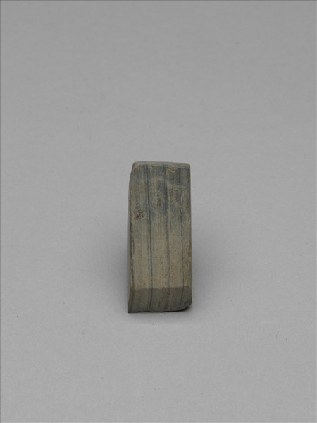 條紋,深淺不一的灰色條紋。對稱梯形,小型,器體小而厚實,四邊切割整齊,背面平整,正面伏鼓,有段,聯部(上身)與用部(下身)間的落階較深,兩部分的比例接近,聯部面有剝製痕,器兩側平整,全器器表拋磨光滑;平刃略斜,偏鋒,刃緣一端角崩傷,餘皆屬小傷。