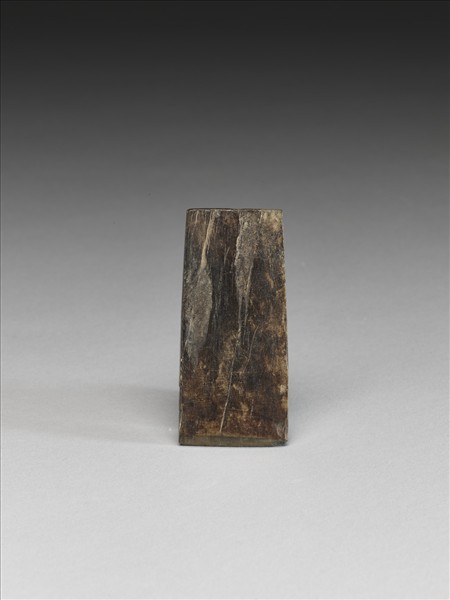 褐灰色。對稱梯形,小型,器體扁平,四邊切割整齊,背面平整,有一些打剝痕,正面微鼓,有段,聯部(上身)與用部(下身)間的落階較淺,兩部分的比例接近,聯部面不平整,多剝製痕,器兩側平整,惟留一些打剝痕,全器器表拋磨光滑;平刃,偏鋒,刃緣一端角有崩傷,餘僅是一些小傷。