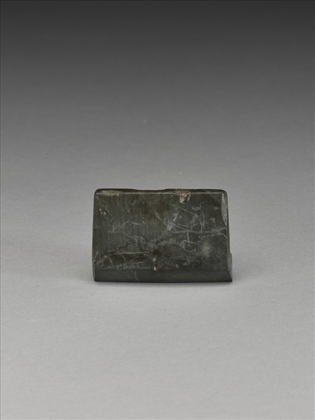 鐵灰色。對稱梯形,小型,器體短而扁平,四邊切割整齊,背面平整,正面微鼓,有段,聯部(上身)與用部(下身)間的落階較淺,聯部比用部大,聯部面平整,器兩側平整,全器器表拋磨光滑,全器似經多次重磨;平刃略斜,偏鋒,刃緣有一些細傷。