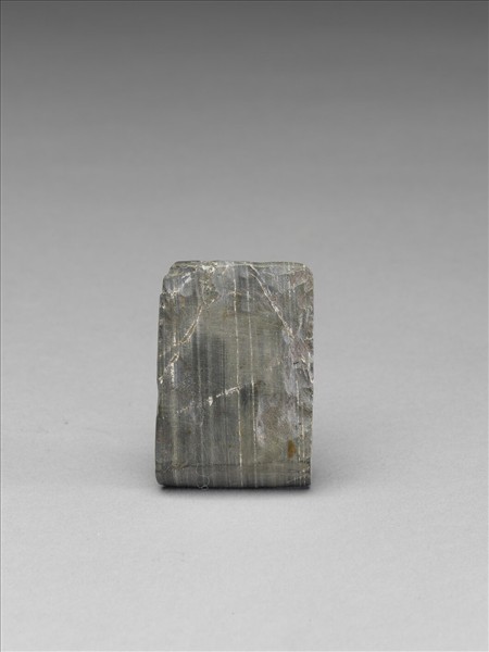 細直線條紋,暗灰青色。長方形,小型,器體扁平,四邊切割尚稱整齊,背面平整,有多處打剝痕,正面微鼓,有段,聯部(上身)與用部(下身)間的落階極淺,兩部分的比例接近,聯部面有剝製痕,尚稱光滑,器一側平整,一側有多處打剝痕,全器器表拋磨光滑;平刃,偏鋒,刃緣有一些細傷。
