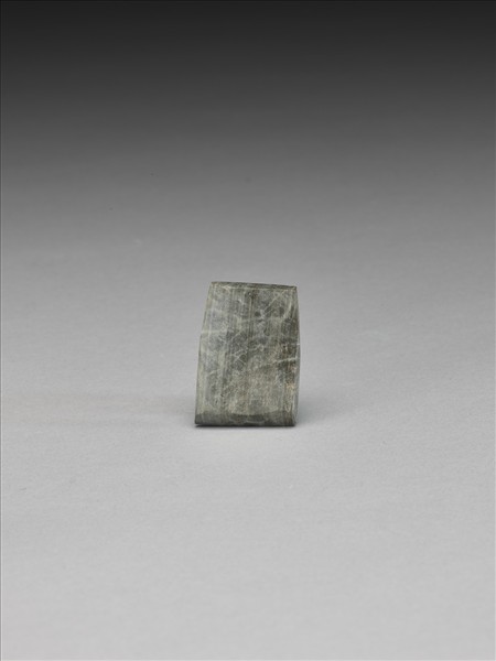 絲網紋斑,細直線條紋,灰青色。對稱梯形,小型,器體扁平,四邊切割整齊,背面平整,有一處打剝痕,正面微鼓,有段,聯部(上身)與用部(下身)間的落階極淺,兩部分的比例接近,聯部面有剝製痕,尚稱光滑,器兩側平整,全器器表拋磨光滑;平刃略斜,偏鋒,刃緣有一些細傷。