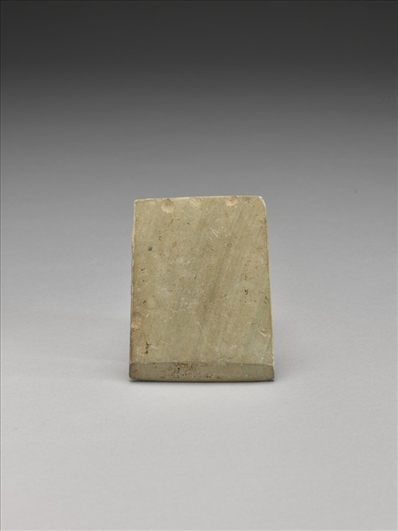 斜線條紋,灰褐色。對稱梯形,小型,器體扁平,四邊切割整齊,背面平整,正面微鼓光滑,有段,聯部(上身)與用部(下身)間的落階較淺,兩部分的區分清楚,聯部面尚稱平整光滑,器兩側平整,全器器表拋磨光滑;平刃,偏鋒,刃緣有細傷。