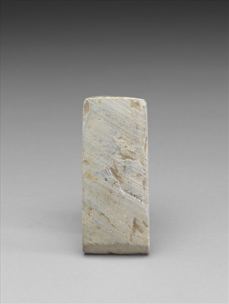 斜線條紋,灰綠色。幾近於長方形,小型,器體扁厚,四邊切割整齊,背面平整微鼓,正面微鼓斜平光滑,有段,聯部(上身)與用部(下身)間有一凸脊,兩部分的區分尚稱清楚,聯部面尚稱光滑,有剝製痕,器兩側平整,全器器表拋磨光滑;平刃,偏鋒,刃緣有小傷。