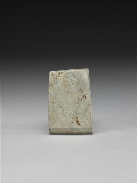 斜線條紋,灰色。對稱梯形,小型,器體扁厚,四邊切割整齊,背面平整有打剝痕,正面略鼓光滑,有段,聯部(上身)與用部(下身)間有一凸脊,兩部分的區分清楚,聯部面尚稱平整光滑,器一側平整,另一側有一處打剝痕,全器器表拋磨光滑;平刃,偏鋒,刃緣有細傷。