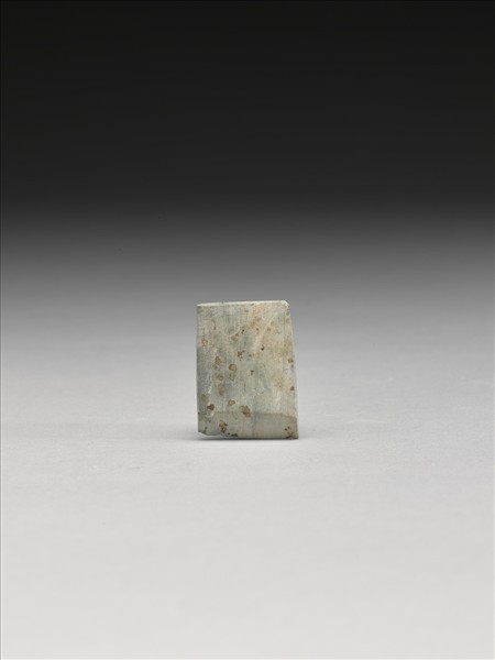絲網紋斑,細直線條紋,灰青色。對稱梯形,小型,器體扁平,四邊切割整齊,背面平整,正面斜平光滑,有段,聯部(上身)與用部(下身)間的落階較淺,兩部分的區分清楚,聯部面尚稱平整,有一點剝製痕,器兩側平整,全器器表拋磨光滑;平刃略斜,偏鋒,刃緣有細傷。