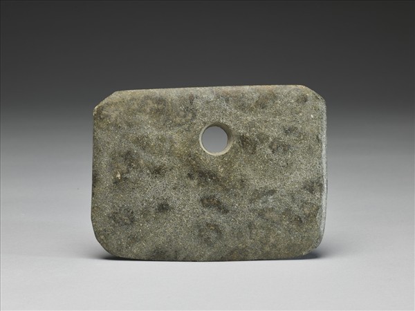 黑雲母安山岩。斑雜細灰綠。不對稱梯形,中型,器體略厚,表面拋磨光滑;斜頂,頂緣整齊,兩端角切斜;器兩側垂直而下;平刃,中鋒(雙面刃),無刃線,刃緣有一些細小傷;一孔,兩面對鑽,孔壁旋紋細而不清楚,中間有一交會凸稜。