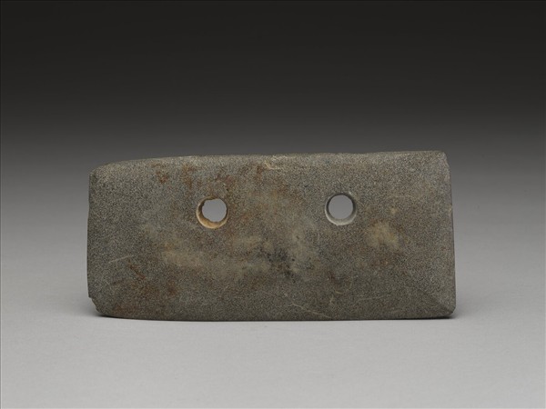 細的白沙點灰色,表面輕微風化。對稱梯形,中型,器體略鼓厚,兩側成微斜邊,表面拋磨光滑;平頂,頂緣經仔細的修飾,一面尚留製作崩傷;平刃,中鋒(雙面刃),無刃線,刃緣磨飾精細,刃一端微崩傷,刃緣不見明顯的使用傷;二孔略小,兩面對鑽,孔壁幾近於垂直,旋紋細而不清楚,中間有一交會凸稜。