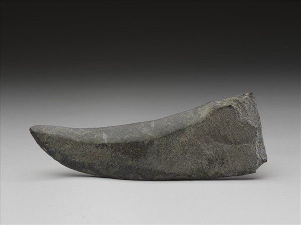 灰褐色。犀角形,小型,器體扁而厚薄不一,尖端較厚,柄端略薄而器面略粗,表面大體均經拋磨過;凸弧頂,頂緣磨飾過,保留大一部分的製作崩傷痕;凹弧刃,偏鋒(單面刃),刃線清楚,刃緣有不少小崩傷;(屬使用傷)無孔。