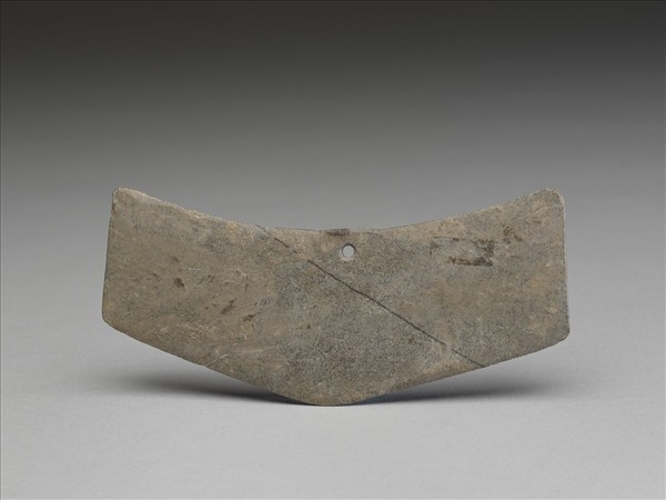 細的白沙點灰色,表面風化較嚴重。菱角形,小型,器體扁薄,表面平滑,惟全面風化成均勻的土灰色;凹弧頂,中間下方鑽一小孔,頂緣基本上磨渾;兩邊折刃,刃線模糊,刃緣磨飾精細,見不到任何崩傷或使用傷;一孔甚小,兩面對鑽,孔壁亦經風化成土灰色。