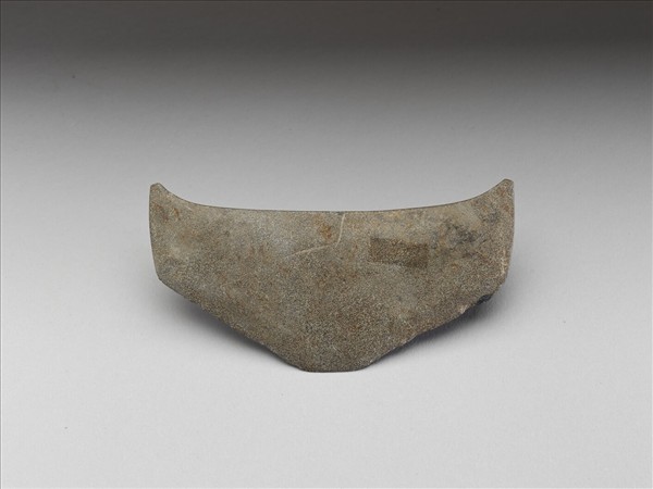 細的白沙點灰色,表面風化較輕微。菱角形,小型,器中體鼓厚,表面平滑;平頂兩側飛尖,頂緣磨飾整齊,器兩側直下;兩邊折刃,中間有一平刃部份,刃線模糊,刃緣有多處小傷;無孔。