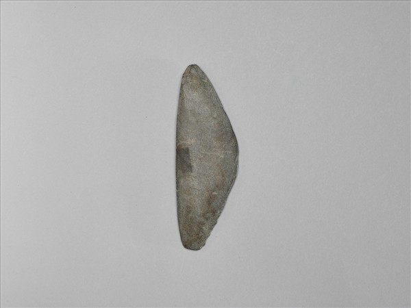 灰褐色。倒的等腰三角形,小型,器體中略厚,表面拋磨光滑;平頂,頂緣磨飾整齊;器一翼傷缺;折刃,中鋒(雙面刃),刃線不清楚,刃緣有不少小崩傷(屬使用傷);無孔。