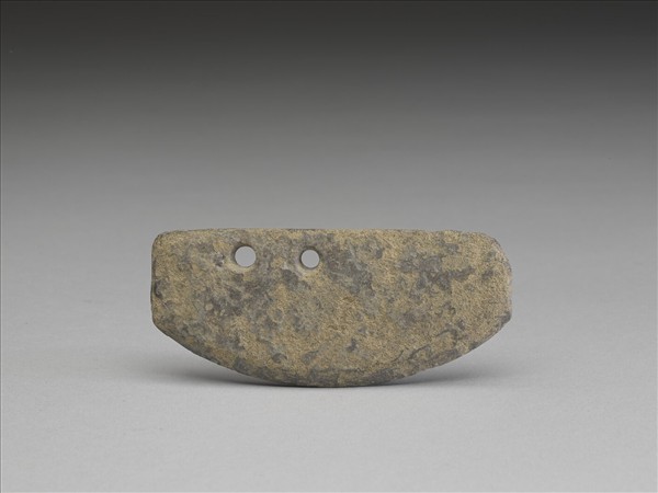 褐灰色,風化較嚴重。半圓形,小型,器體扁薄,表面平整但不光滑;平頂,頂緣修飾整齊;器呈不對稱半圓形;圓弧刃,偏鋒(單面刃),刃線清楚,刃緣有使用傷痕;兩孔並排,較小,兩面對鑽。