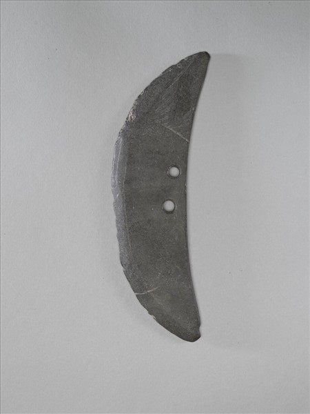暗灰色,輕微風化。新月形,小型,器體扁薄,表面平整光滑;凹弧頂,頂緣修飾整齊;器兩翼略不對稱;圓弧刃,偏鋒(單面刃),刃線清楚,刃緣有使用傷痕;兩孔一高一低並排,較小,兩面對鑽。