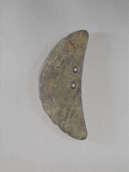 絲網紋斑,斜線條紋,灰褐色。半月形,小型,器體中略厚,表面拋磨光滑;凹弧頂,頂緣磨飾整齊;器兩翼對稱;圓弧刃,中鋒(雙面刃),無刃線,刃緣有不少小崩傷;有二小孔並排於器背緣。