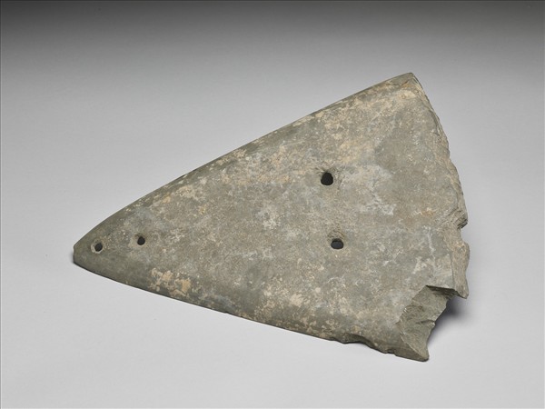 灰色。等腰三角形,大型,器體扁平,器面平整,表面拋磨過;器面三角點各鑽一孔,另有一小孔在三角尖端,其孔的大小不一,孔為兩面琢製,孔緣多處崩剝或琢痕;平刃,偏鋒(單面刃),刃線清楚,刃緣有多處小傷。