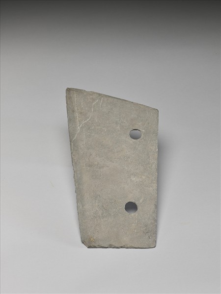 土灰色。不對稱梯形,器體扁平,器面平整,表面拋磨過;背緣平整,沿緣鑽二孔,單面崩琢,孔緣多處崩剝;斜刃,偏鋒(單面刃),刃線清楚,刃緣有多處小傷。 此類器常為人誤以為是斜刀,浙江桐鄉良渚文化遺址出土的組合式石犁之後,方知其原是石犁的組件,此類組合石犁常由三個組件拼合而成。