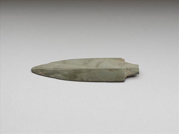 灰色。菱錐形,小型,中脊明顯,兩側對稱,有鋌,鏃體與鋌間區分清楚,表面拋磨光滑;兩側刃帶微傷。