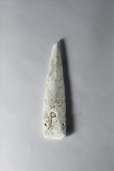 玉質,有赭沁斑。表面粗糙,有打磨痕跡。全器作三角形,中脊明顯,兩側對稱,器身下半部有三孔,一大兩小。
