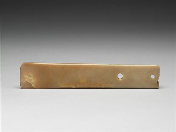 細膩的牙黃玉質,琢作窄長方梯形玉鉞,鉞體剖面作圓角長方形,淺弧正刃,一刃角微收。相似於山東安丘出土玉鉞。沿中軸線鑽二孔,靠近柄端的小孔由單面鑽鑿,另一較大圓孔由兩面對鑽。一面在小孔與柄端間器表多刮痕,另一面小孔與大孔間器表留有多個鑽鑿淺圓凹,似最初製作時,曾更換擬鑽孔的部位。