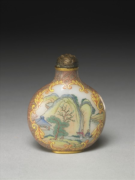 乳白玻璃胎,直口,短頸,扁平圓腹,圈足。以畫琺瑯為飾,壺腹兩面有金色莨苕葉邊飾開光,內繪山水人物,開光隙地飾不規則圖案。口緣及圈足塗金彩,圈足內白地藍書「乾隆年製」四字二行楷款,附龍紋銅蓋及牙匙。