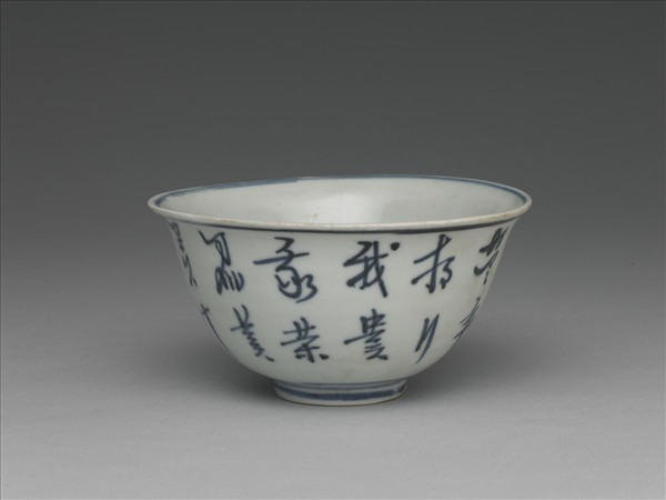 口外撇,鼓腹碗,具圈足。器內口緣青線一道,碗心單圈內有「狀元及第」四字;外壁口緣與近足處各一道青線,器腹以一行兩字書寫草書詩:「龍樓鳳閣九重城,新築沙堤宰相行,我貴我榮君莫羨,十年前是一書生。述古。」書體奔放,多加裝飾性筆劃。足外壁青線兩條,其內有款:「長貴」。