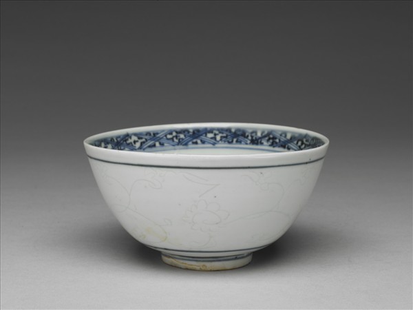 碗,敞口深壁,矮圈足。器外壁口沿、器底和足處青花繪飾弦紋,器身暗花飾花卉紋。器內壁口沿下繪海水江牙紋一周,器底兩圈弦紋內繪花卉紋。器外底青花畫花押。