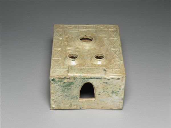 陶灶,灶體呈長方形,轉角硬折明顯,整器略近一長立方體,內壁露胎無釉,外壁滿釉而色近土黃,或釉中有加鉛為助融劑,故見有綠色流淌痕。方形灶門。灶上設有三個火眼(釜孔),火眼直徑一大二小,另整器外壁也只有火眼所在的壁面才有裝飾,其中火眼略弧起,並見瓢、杈等廚具,周繞方格網紋一圈。無底。內壁尚殘留泥土。
