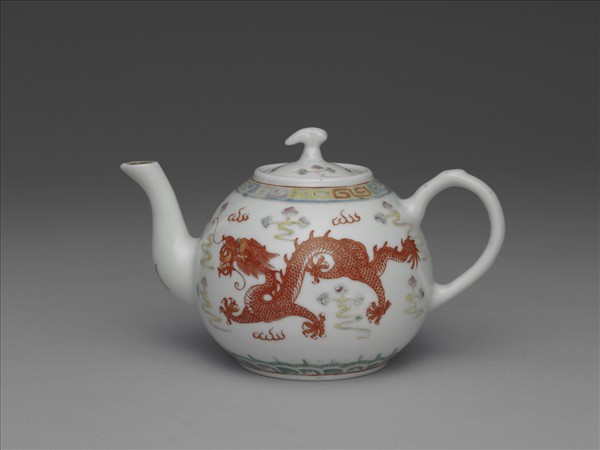 粉彩茶壺。壺圓口,圓身,把形弓,曲流嘴,拱形蓋帶幾何類鳥形鈕,鈕側有一通氣孔。外壁飾以釉上多彩紋飾,器腹上下分別飾回紋、波濤紋各一圈,中央繪飾紅彩行龍,四周綴以五彩十字祥雲,圖式可上溯至明代宣成時代的鬥彩器。又由流上紅料「壽」字看來,這或是為祝壽而製作的器物。器底紅料書「大清光緒年製」二行六字楷款。