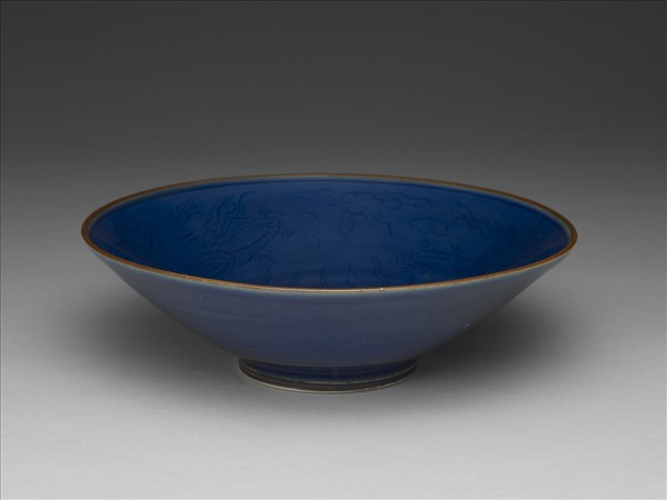 敞口碗,深斜壁,圈足,內外壁施霽青釉,釉不及底,其色沈靜而略透,隱約可見內壁胎體上刻劃之雙龍戲珠紋。圈足、口緣、即足牆部份露胎,均塗以褐色汁。無款識。