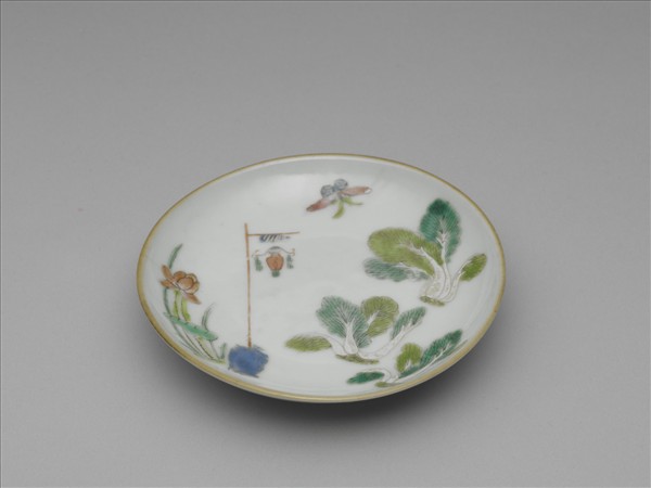 敞口碟,口緣有金彩,深弧壁下斂,圈足。器外釉上彩繪白菜、荷花數叢,白菜與荷花圖像幾乎等大,並且位於為於同樣平面,造成遠近無別的剪貼效果。荷花與白菜間,見有一弔掛花瓶的支架,或許指向「平安」一類的吉祥意涵。內底心繪桃實,或有添壽一類的吉祥意涵。足緣露胎一圈,圈足內紅料書「同治年製」二行四字單方框篆款。