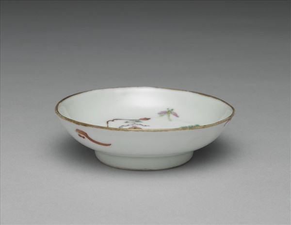 敞口碟,口緣有金彩,深弧壁,圈足略高。盤內壁釉上彩繪白菜、荷花數叢,白菜與荷花圖像幾乎等大,並且位於為於同樣平面,造成遠近無別的剪貼效果,除此之外,又繪有蝴蝶與一弔掛花瓶的支架,或許指向「平安」一類的吉祥意涵。外壁裝飾簡潔,只以紅釉等距繪三個類如意的簡筆圖像。足緣露胎一圈,圈足內紅料書「同治年製」二行四字雙方框篆款。