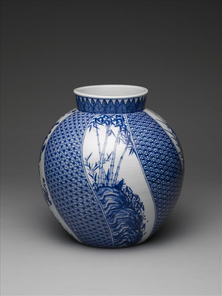 此罐直立口,斜肩,圓腹,平底。全器內外壁連同足底施白釉,並於上頭繪飾青花圖案。口緣繪飾一圈蕉葉紋,罐腹區分成八帶狀區塊,其中四段繪飾長於石上之梅、蘭、竹、菊圖案。四花卉間之區塊皆繪滿各式錦地圖案,分別為水紋、三角紋、與四瓣朵花卉紋錦地。罐底書藍色兩字,推測可能為「五山」。