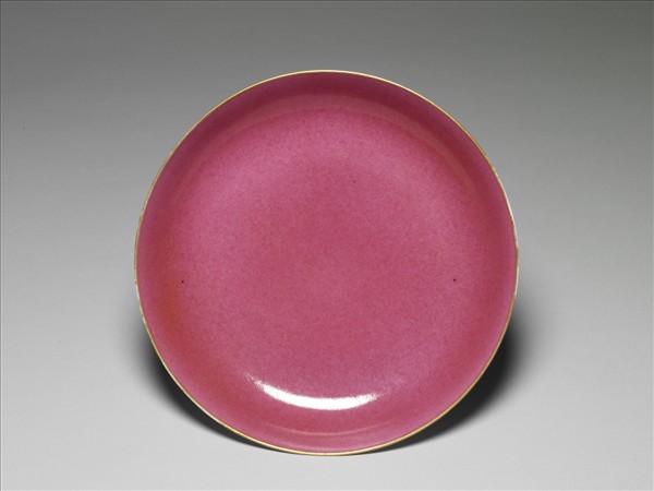 盤,敞口微斂,弧壁,平底,圈足。口沿處繪金邊,器內施胭脂紅釉,器外壁施白釉。底書「大清光緒年製」雙行楷款。