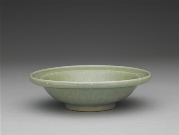 碟,侈口寬唇,淺弧壁,平底圈足。全器施青釉,足底露胎,具開片紋。