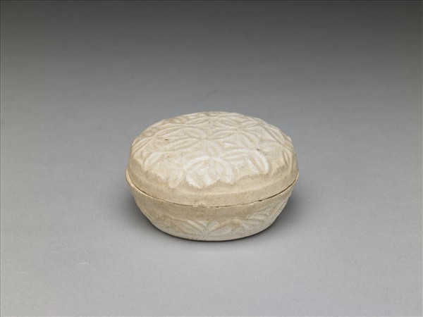 錢紋盒,子母口,平頂蓋,淺壁平底。全器施白釉,釉色泛黃,底露胎無釉。蓋面及器外壁刻印錢幣紋。