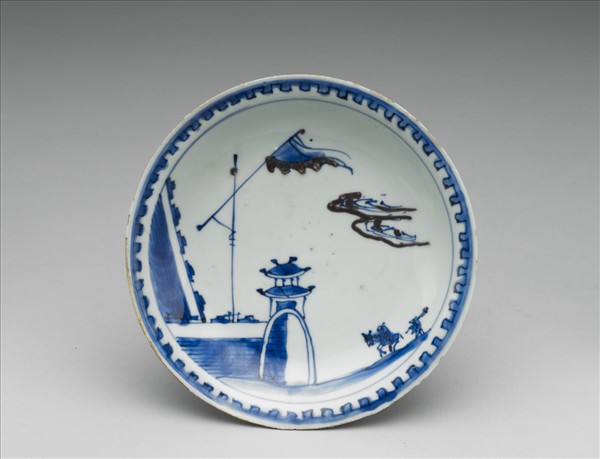 撇口弧壁淺盤,帶微斂圈足,圈足內跳刀一圈,底有砂粒。盤內以青花描繪中國式建築城牆,左側露出城垛一角,其上插有旌旗,旁為兩雲朵,城外有一騎馬人物與隨侍,旗與雲彩輪廓以釉下紅彩飾點;器內緣裝飾如城垛的凹字紋飾一圈,外壁口緣與圈足上端各有一道青線,器腹等距有三朵簡筆花朵。元代景德鎮已能燒製出成熟的青花釉裡紅,但實則燒製不易,明代時亦少見。