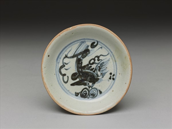 撇口、淺壁、斂足盤,口緣與圈足著地處無釉,露胎處呈橘色,器表多細開片。盤心中央開光內描繪一回首獸紋,右上角有半月形紋,雖然筆法瀟灑而簡略,但仍可想見原欲表現「犀牛望月」的典故。這類作品常見於東南亞海域沉船遺跡,景德鎮窯址十五世紀中葉遺跡亦有出土例。