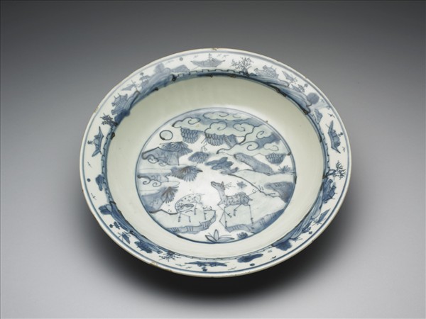 這件盤子的裝飾紋樣和器形是十七世紀外銷瓷常見的類型之一。盤呈圓侈口,口沿向外凸出一道折邊,矮圈足,底部沾黏墊燒留下的砂粒,依胎釉特徵及燒造痕跡來看,應屬福建漳州窯作品。盤面以青花繪山水及鹿紋,折沿畫一周船隻及屋宇等圖案;外壁繪蓮花和桃實,間以青花弦紋。全器紋飾佈局率真而寫意,青花設色簡淡,饒富民間趣味。除漳州窯外,景德鎮同時期生產的卡拉克瓷,同樣也以外銷為主,不僅大量運銷歐洲,也影響了日本伊萬里有田燒的風格。